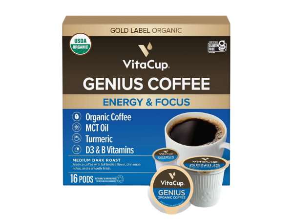 VitaCup Genius Coffee Pods are designed for convenience and brain support, combining premium coffee with functional mushrooms and essential vitamins. Packaged in single‑serve pods, they make it easy to brew a cup that not only energizes but also nourishes.