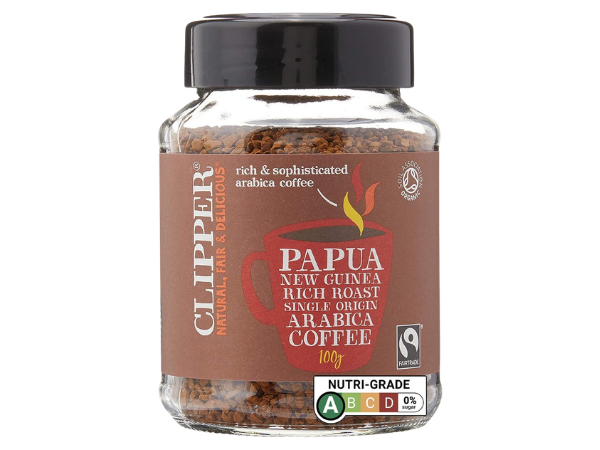 Clipper’s Organic Latin American Instant Coffee is a medium roast blend made from Arabica beans. As an instant coffee, its caffeine content typically ranges between 60–90 mg per cup, depending on preparation.