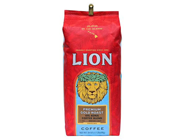 Lion’s Premium Gold Roast is a blend that includes 10% Kona coffee, making it more accessible than the 100% Kona version while still offering a taste of Hawaii’s most famous beans.